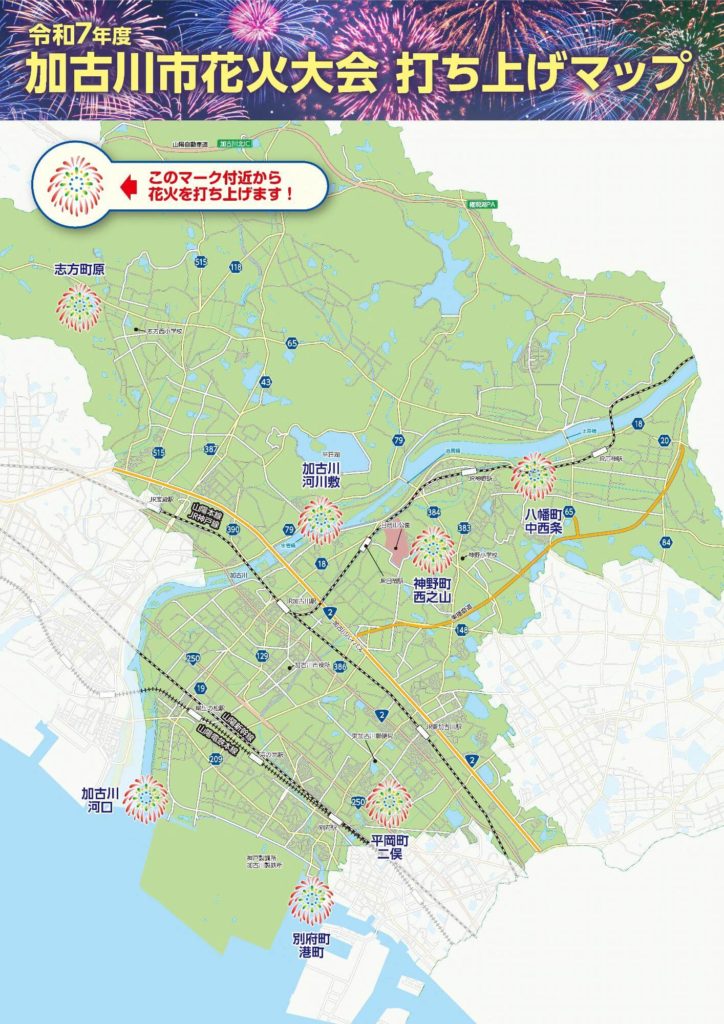 打ち上げ場所は志方町原、加古川河川敷、八幡町中西条、神野町西之山、